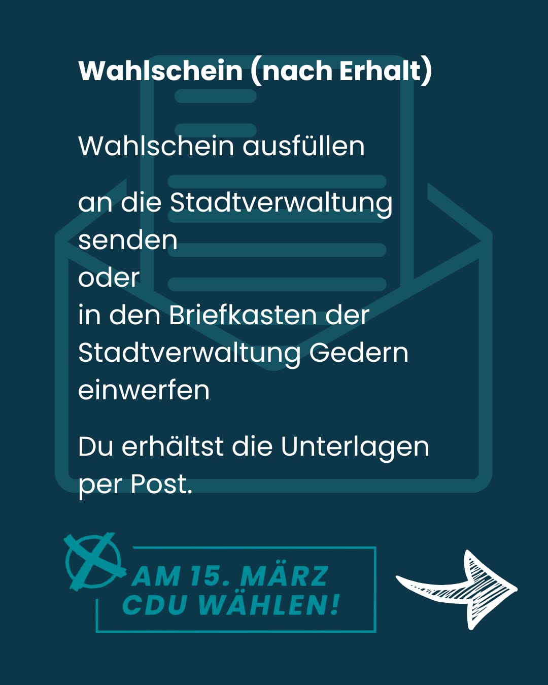 Die Erteilung eines Wahlscheines kann schriftlich (z. B. durch Übersendung der ausgefüllten Wahlbenachrichtigung) bei der Gemeindebehörde beantragt werden. Die Schriftform gilt auch durch Telefax, E-Mail oder durch sonstige dokumentierbare elektronische Übermittlung als gewahrt.