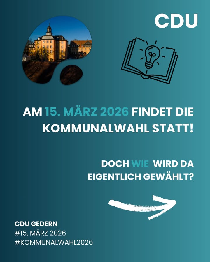 🔷 Kommunalwahl am 15. März 2026 - diese Wahlmöglichkeiten hast du. 🔷Am Sonntag, den 15.03.2026, ist es wieder soweit: In ganz Hessen - und natürlich auch bei uns in Gedern und im Landkreis Wetteraukreis - finden die Kommunalwahlen statt.👉 Welche Wahlmöglichkeiten hast du?🔷 Listenwahl🔷 Kumulieren (anhäufen)🔷 Panaschieren (mischen)Gut zu wissen:▶Alle Wahlen finden an einem Tag statt.▶Es gibt somit mehrere Stimmzettel.▶Die gewählten Gremien arbeiten für 5 Jahre.🔷 Mitbestimmen lohnt sich - Kommunalpolitik betrifft unseren Alltag.Also: Termin gleich vormerken und am 15.03.2026 wählen gehen. ✅#kommunalwahl2026 #Kommunalpolitik #demokratievorort #wählengehen #mitbestimmen #gedern #wetteraukreis #hessen #stadtvertretung #kreistag #bürgerbeteiligung #politikvorort #deinestimmezählt #zukunftgestalten #fürgedern #cdugedern