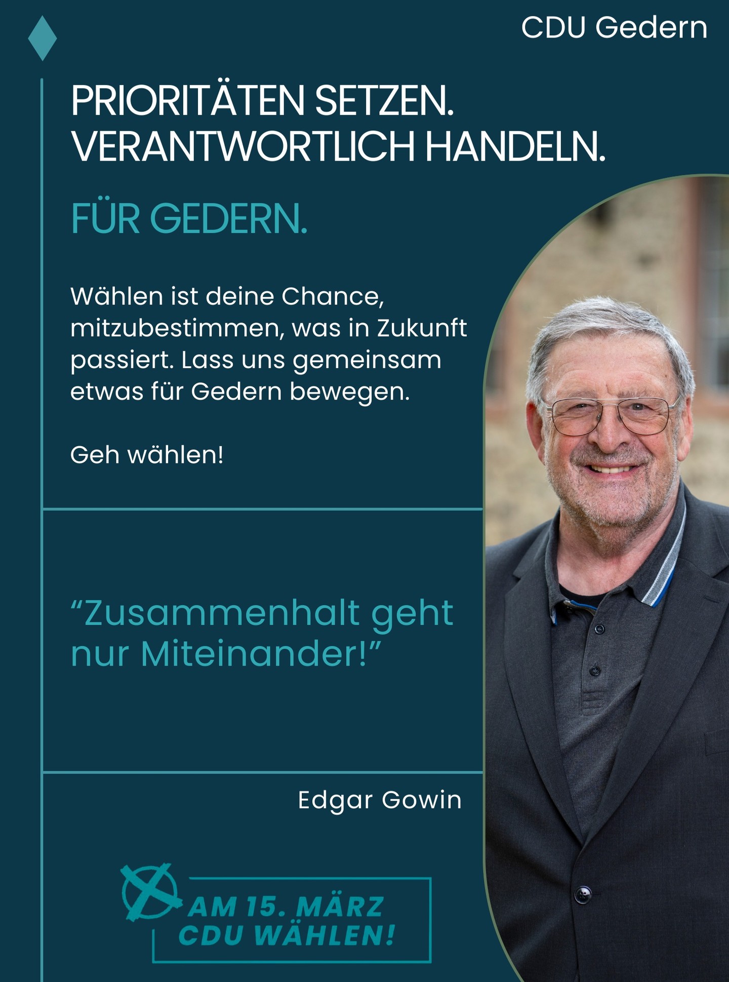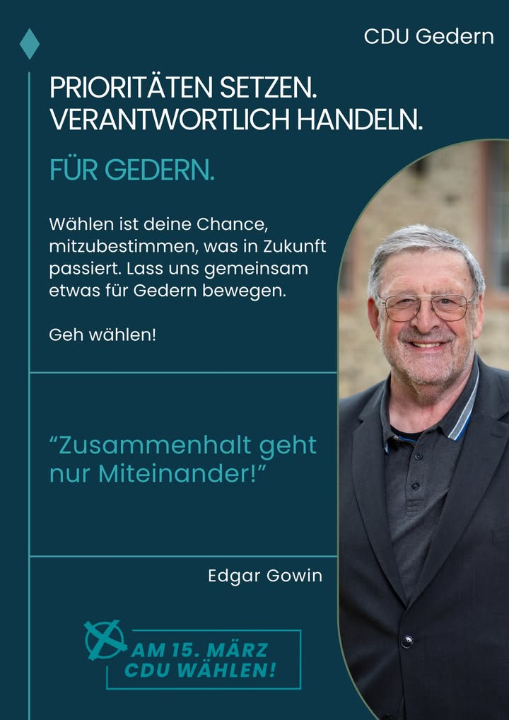 mehr💪 Gemeinsam stark für Gedern! CDU Gedern ? engagiert, kompetent und mit ganz unterschiedlichen Expertisen. Ob Wirtschaft, Soziales, Umwelt, Vereine oder Stadtentwicklung: 👉 Jede und jeder von uns bringt Erfahrung, Herzblut und neue Ideen mit. Als Team sind wir stark ? für unsere Stadt, für unsere Zukunft, für ein lebenswertes Gedern. 🏡✨ Am 15.03.2026 entscheidest DU mit! 🗳️ Deine Stimme zählt. Deine Stimme bewegt. Deine Stimme für Gedern. #CDUGedern #Kommunalwahl2026 #Gedern #Teamarbeit #GemeinsamStark #IhreStimmeZählt #FürGedern #Kommunalpolitik #ZukunftGestalten