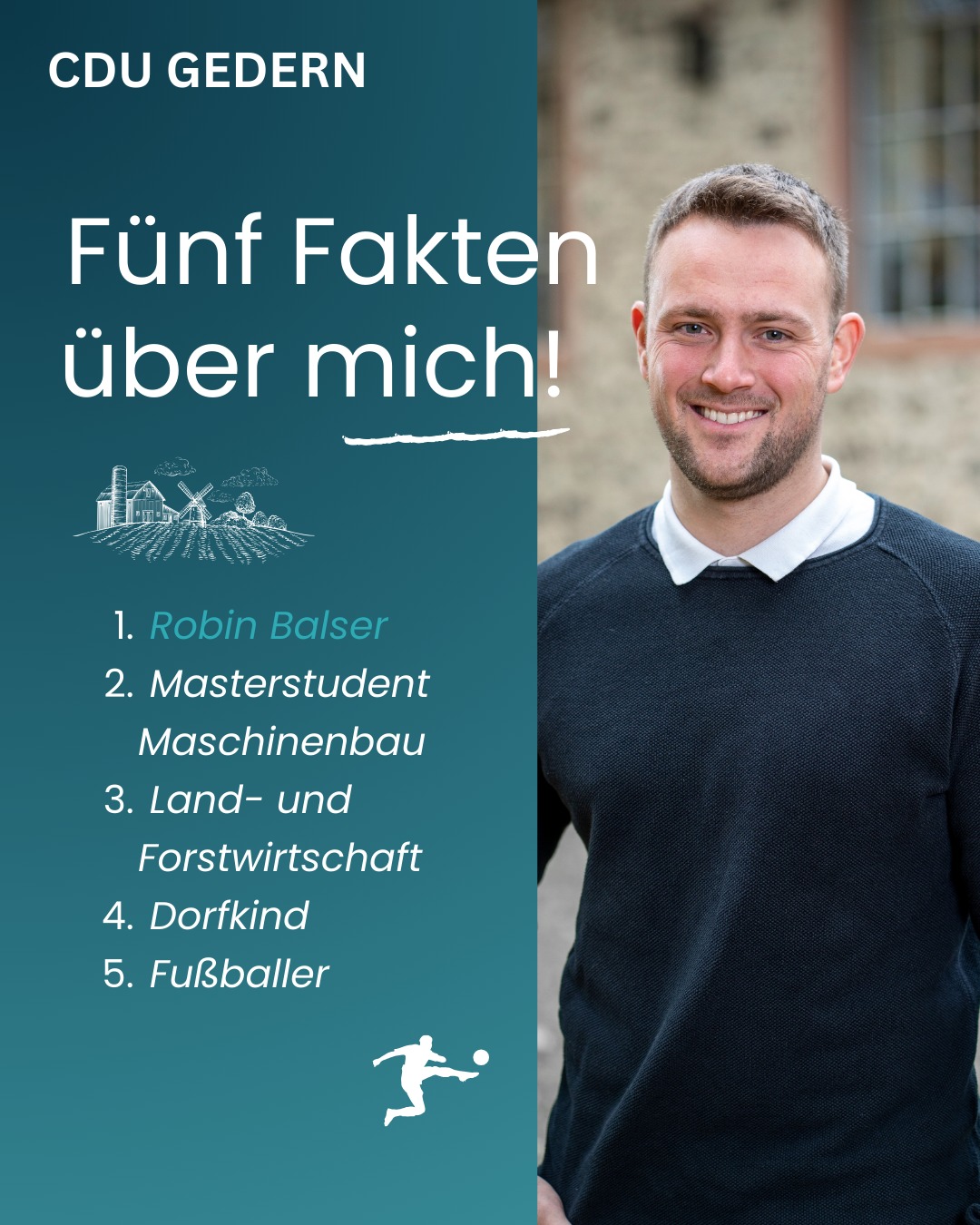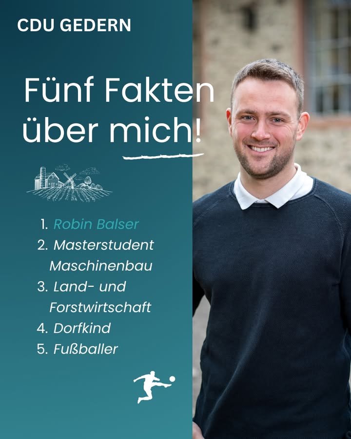mehr👉 Fünf Fakten über unseren Kandidaten für euch mit regionaler Identifikation und dem Blick für Gederns Zukunft: Robin Balser Listenplatz 12 Prioritäten setzen. Verantwortlich handeln. Für Gedern. #kommunalwahl2026 #cdugedern #fürgedern