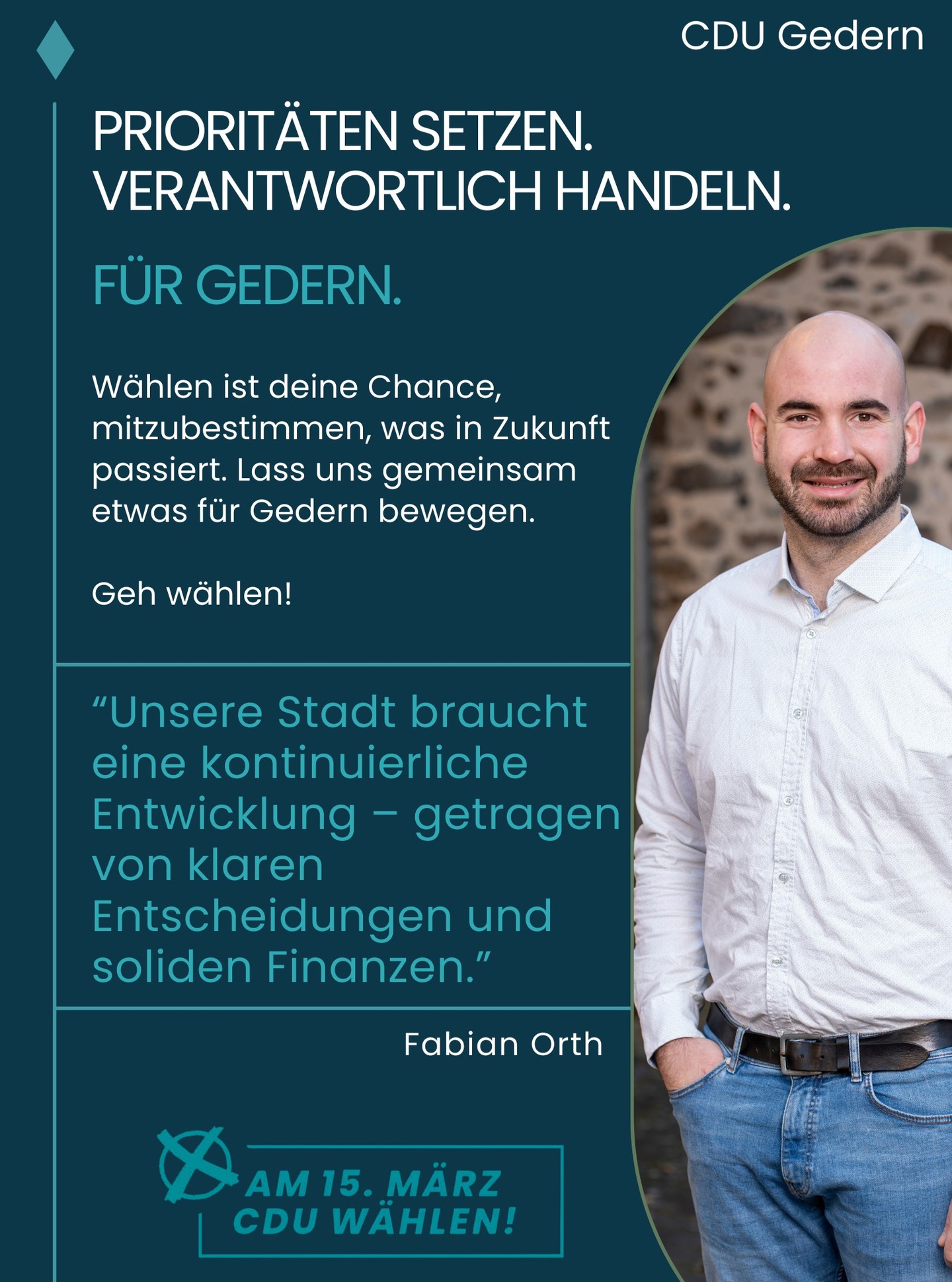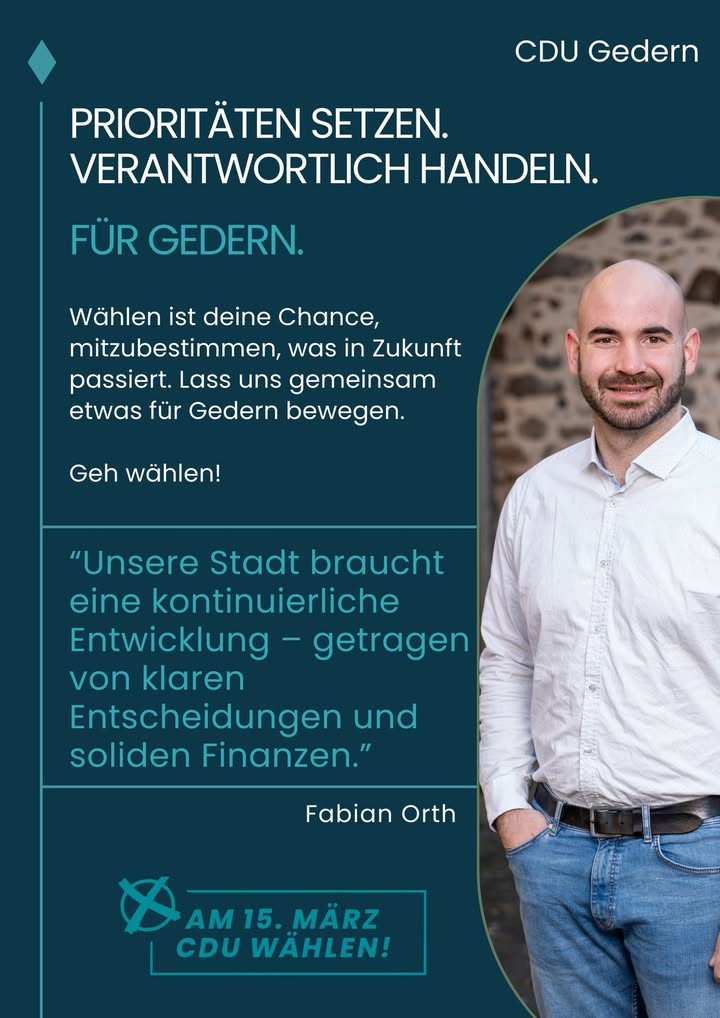 mehr🌍 Gedern braucht klare Prioritäten und verantwortungsvolles Handeln! Am 15. März 2026 entscheiden wir gemeinsam über die Zukunft unserer Stadt. Die CDU Gedern steht für Verlässlichkeit, solide Finanzen und eine starke Gemeinschaft. 👉 Jetzt ist die Zeit, Verantwortung zu übernehmen. 👉 Jetzt ist die Zeit, Prioritäten zu setzen. 👉 Jetzt ist die Zeit für eine starke Zukunft für Gedern. 🔷 Deine Stimme zählt! Gestalte mit uns die Zukunft unserer Stadt. #cdugedern #gedern #kommunalwahl2026 #15märz2026 #deinestimmezählt #prioritätensetzen #verantwortung