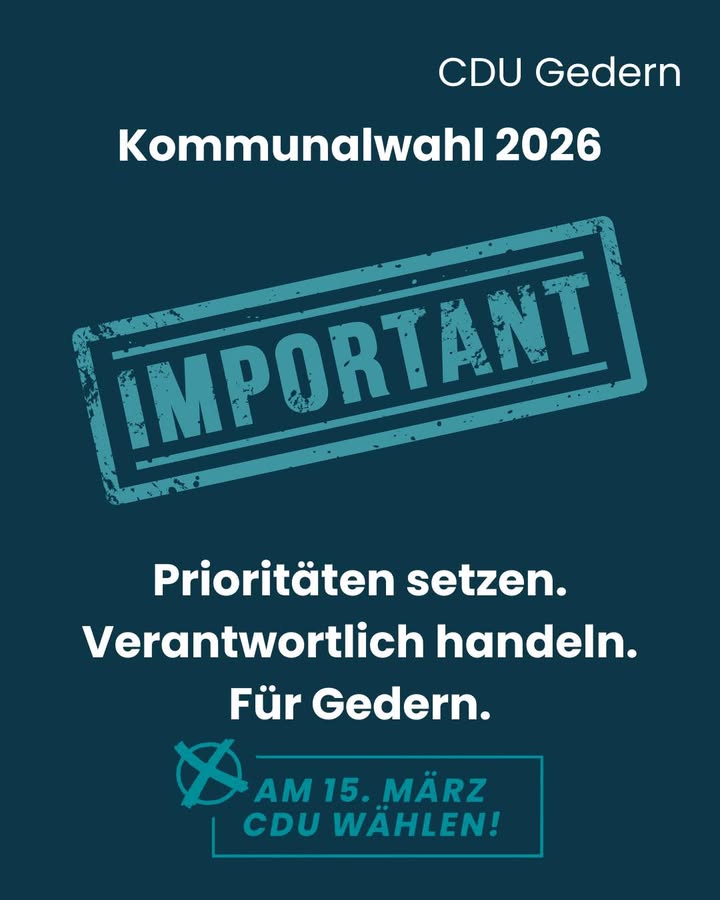 mehr📅 Kommunalwahl am 15.03.2026 Gedern steht vor wichtigen Entscheidungen. Jetzt geht es um klare Prioritäten, verantwortungsvolles Handeln und eine starke Zukunft für unsere Stadt. Die CDU Gedern setzt sich ein für: ✅ Solide Finanzen ✅ Stärkung unserer Vereine und des Ehrenamts ✅ Verlässliche Infrastruktur ✅ Unterstützung von Familien und Gewerbe ✅ Nachhaltige Entwicklung mit Augenmaß Wir übernehmen Verantwortung ? für heute und für kommende Generationen. 🗳️ Am 15. März 2026: Ihre Stimme für ein starkes Gedern! #Kommunalwahl2026 #Gedern #CDUGedern #Verantwortung #ZukunftGestalten #HeimatStärken