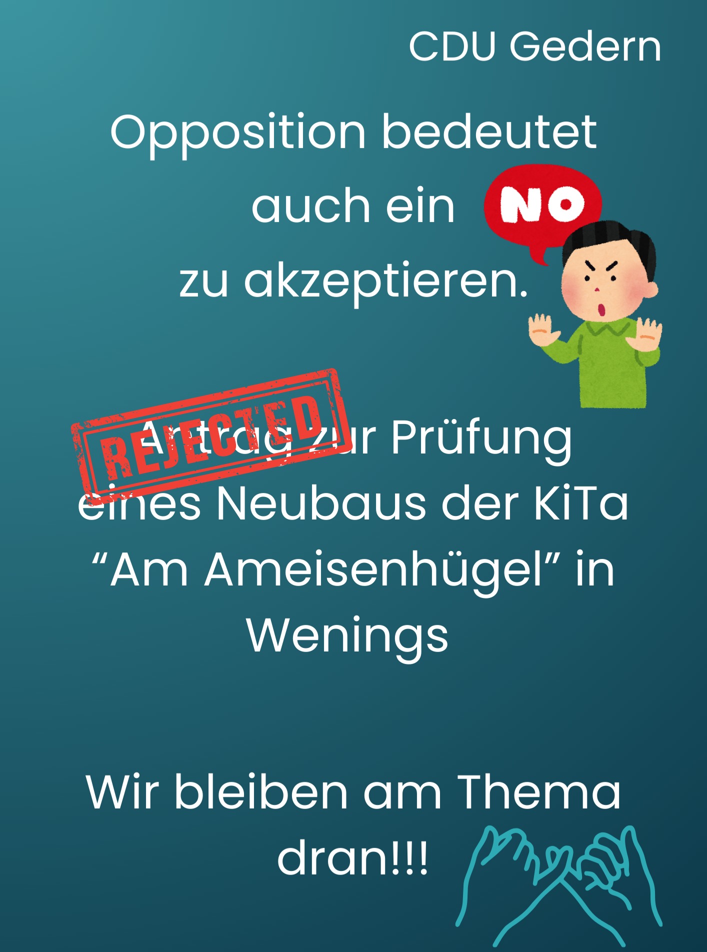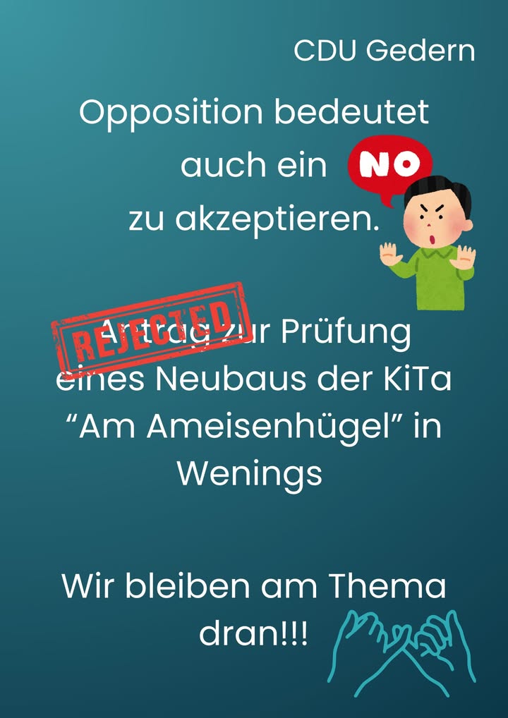 mehrWas bedeutet eigentlich "Opposition" in der Stadtverordnetenversammlung?In einer Stadtverordnetenversammlung gibt es ? wie auch in anderen Parlamenten ? eine Mehrheit und eine Opposition.Die Mehrheit trifft Entscheidungen. Die Opposition kontrolliert diese Entscheidungen, hinterfragt Vorschläge kritisch, bringt eigene Ideen und Anträge ein und setzt sich für alternative Lösungen ein. Sie ist ein wichtiger Bestandteil unserer Demokratie ? denn Kontrolle, Transparenz und Diskussion gehören zu einer lebendigen politischen Arbeit dazu.Unser aktuelles Beispiel:Wir haben einen Antrag zur Prüfung eines möglichen Neubaus der Kindertagesstätte "Am Ameisenhügel" in Wenings eingebracht. Ziel war es, frühzeitig zu klären, wie eine zukunftsfähige Betreuungssituation für unsere Kinder sichergestellt werden kann.Dieser Antrag wurde von der Mehrheit abgelehnt.Auch wenn unser Vorschlag keine Zustimmung gefunden hat, bleiben wir an dem Thema dran. Denn die Entwicklung unserer Stadtteile und eine verlässliche Kinderbetreuung sind zentrale Zukunftsfragen.Demokratie lebt vom Austausch unterschiedlicher Meinungen ? und vom Engagement für gute Lösungen.#Stadtverordnetenversammlung #Opposition #Demokratie #Kommunalpolitik #Wenings #Kindertagesstätte #ZukunftGestalten