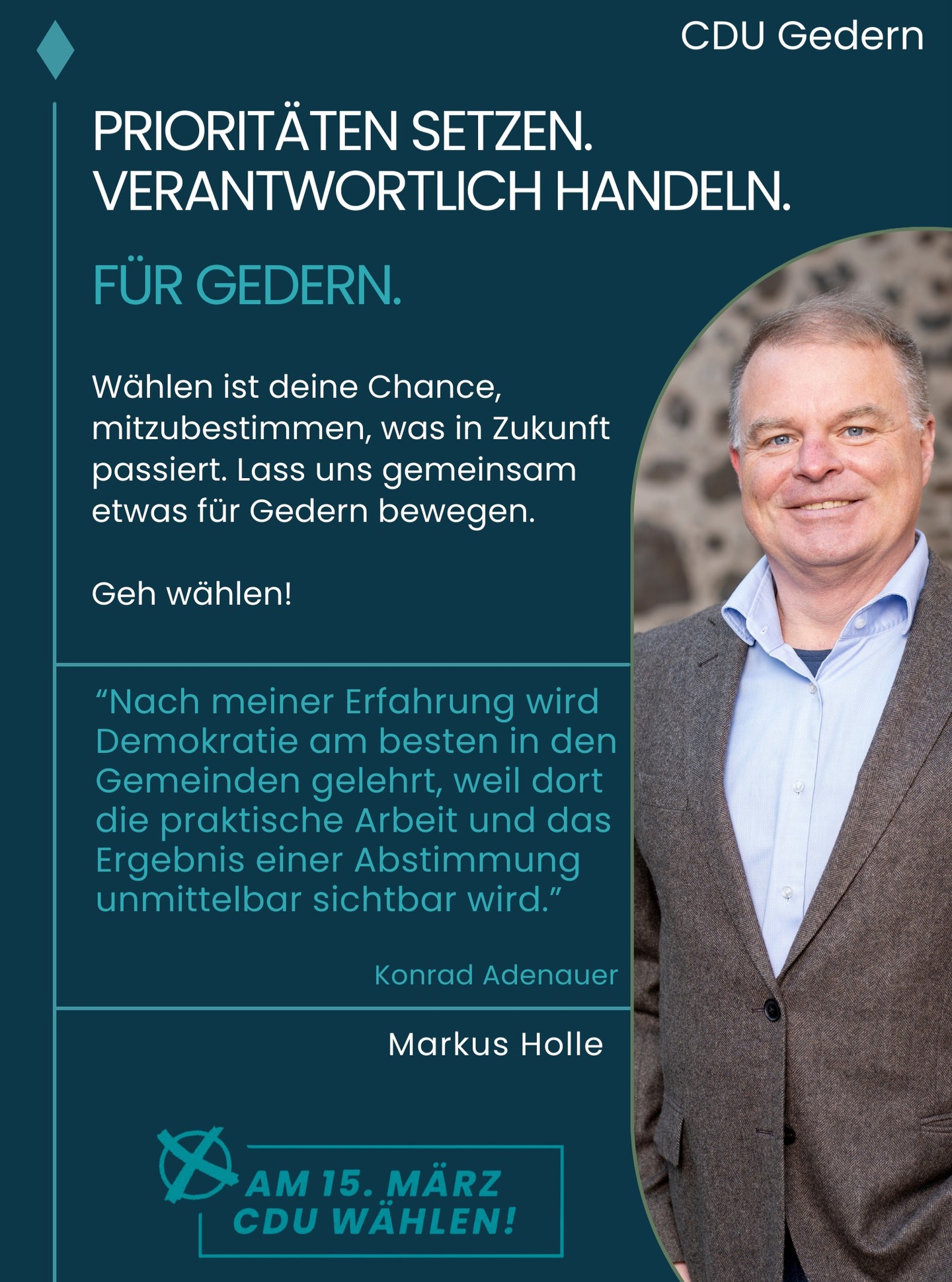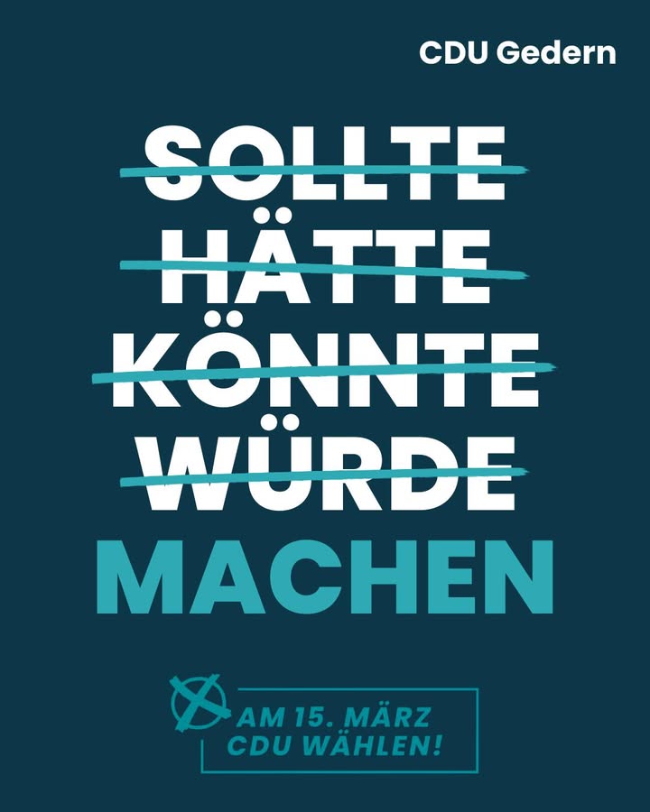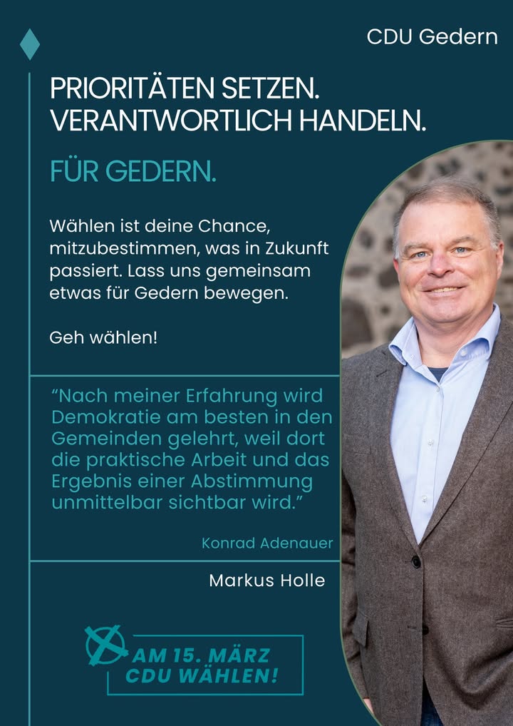 mehrAm 15. März 2026 ist Kommunalwahl.Wenn du nicht hingehst, entscheiden andere über deine Zukunft ? oft die Lautesten.Deine Stimme zählt.Für ein lebenswertes Gedern,für verantwortungsvolle Finanzpolitik,für gezielte und nachhaltige Investitionen,für Politik, die zuhört, versteht und entscheidet.👉 Geh wählen. Gestalte deine Stadt mit.CDU Gedern ? zuhören. verstehen. entscheiden.#Kommunalwahl2026 #Gedern #DeineStimmeZählt #WählenGehen #DemokratieStärken #CDUGedern #ZukunftGestalten #Kommunalpolitik #FürGedern