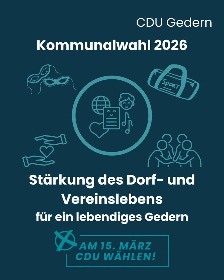 mehr🗳️ Am 15. März 2026 ist Kommunalwahl!Die CDU Gedern tritt mit 18 wählbaren Kandidatinnen und Kandidaten an ? Menschen mit ganz unterschiedlichen Expertisen, Ideen und Erfahrungen.Mit dabei sind neue Gesichter und erfahrene Kommunalpolitiker, die gemeinsam Verantwortung übernehmen wollen.💪 Aus Überzeugung.❤️ Aus Liebe zu Gedern.Wir stehen für Engagement, Sachverstand und den festen Willen, unsere Stadt aktiv weiterzuentwickeln. Gemeinsam möchten wir Zukunft gestalten, Verantwortung tragen und Gedern weiter voranbringen.👉 Gehen Sie am 15. März wählen und unterstützen Sie die CDU Gedern!#Kommunalwahl2026 #Gedern #CDUGedern #FürGedern #VerantwortungÜbernehmen #ZukunftGestalten #TeamGedern #AusLiebeZuGedern #Kommunalpolitik