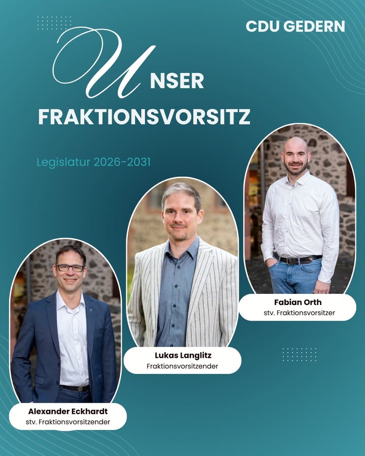 mehrFrischer Start in die neue Legislaturperiode 2026?2031 💼✨ Die CDU-Fraktion in Gedern stellt sich neu auf: 🔹 Lukas Langlitz ? Fraktionsvorsitzender 🔹 Fabian Orth & Alexander Eckhardt ? stellvertretende Fraktionsvorsitzende Gemeinsam gehen wir motiviert, engagiert und mit klaren Zielen in die kommenden Jahre 💪 Für Gedern. Für unsere Zukunft. Für starke Entscheidungen vor Ort. 🏡 #CDU #Gedern #Fraktion #Kommunalpolitik #Teamarbeit #ZukunftGestalten #Engagement #Neustart #PolitikVorOrt