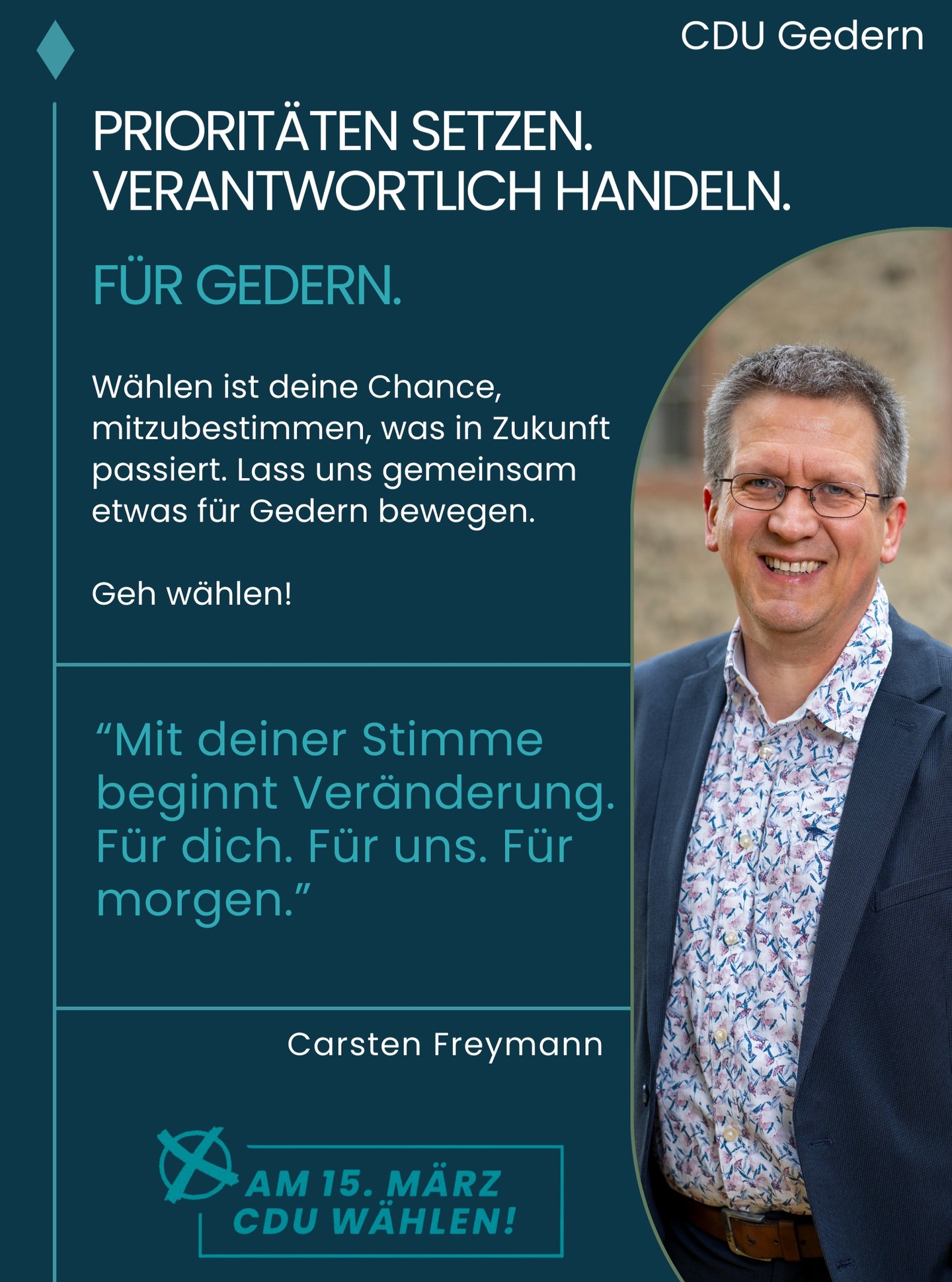 mehr✨ Deine Stimme für Veränderung! Am 15.03.2026 ist Kommunalwahl in Gedern ? und es geht um unsere Zukunft vor Ort! Gemeinsam können wir unsere Stadt weiterentwickeln, Chancen schaffen und Gedern noch lebenswerter machen. Jetzt ist der Moment, Verantwortung zu übernehmen und mitzubestimmen. 💪 Für eine starke Gemeinschaft. 🏡 Für unsere Heimat. 🚀 Für neue Impulse. 👉 Unterstütze die CDU vor Ort und setze ein Zeichen für Veränderung! 📅 15. März 2026 ? Geh wählen! #Gedern #Kommunalwahl2026 #CDUGedern #DeineStimmeZählt #ZukunftGestalten #HeimatStärken