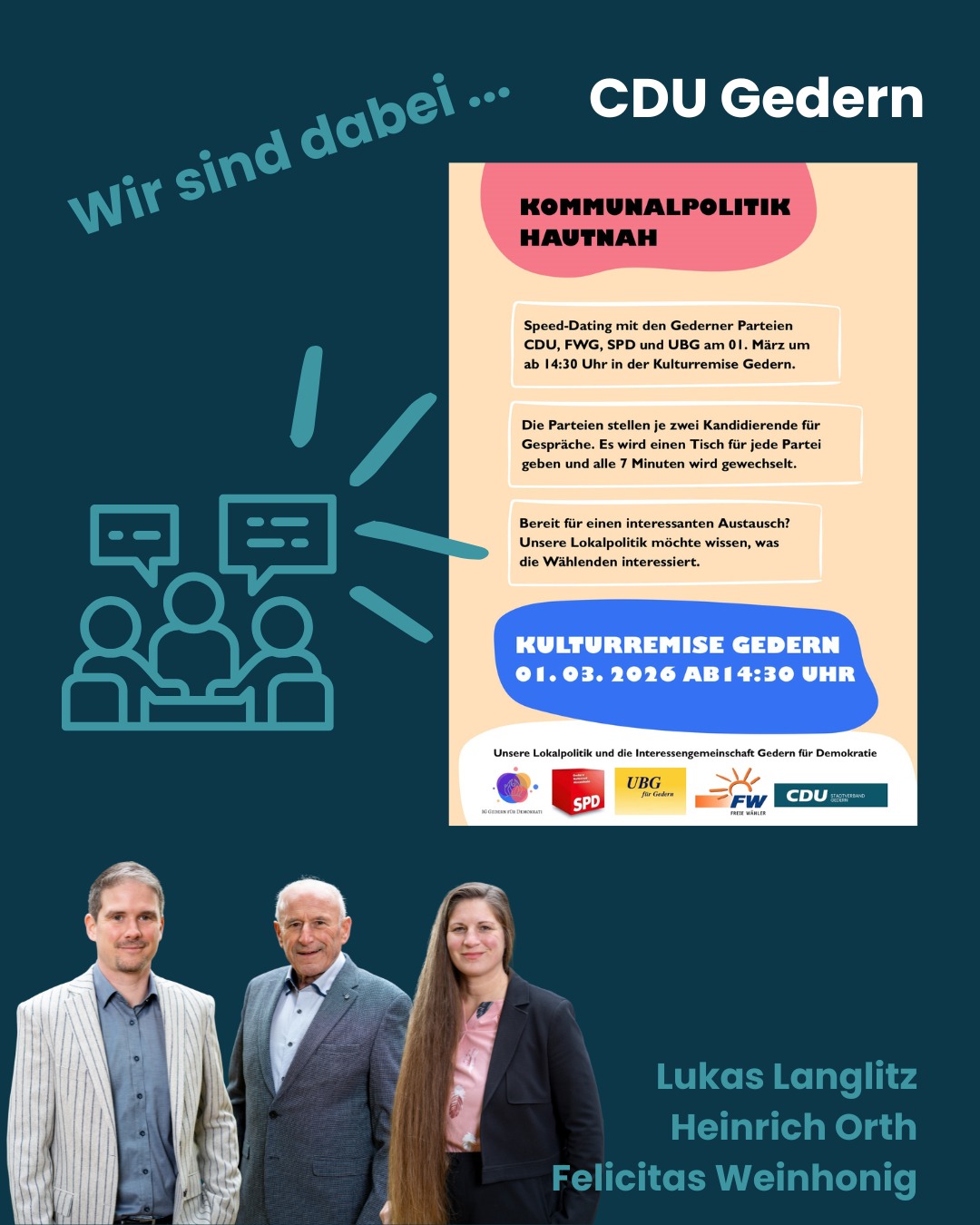 mehr🔥 Speeddating mit den Gederner Parteien! 🔥 Du willst wissen, wofür wir stehen? Du hast Fragen zur Stadtpolitik? Du möchtest direkt ins Gespräch kommen? Dann komm vorbei! 🗓 01. März 2026 🕝 14:30 Uhr 📍 Kulturremise Gedern Mit dabei von der CDU Gedern: 👤 Vorsitzender Lukas Langlitz 👤 Stellvertretende Vorsitzende Felicitas Weinhonig 👤 Magistratsmitglied Heinrich Orth Nutze die Gelegenheit für wertvolle Gespräche, stelle deine Fragen und bring deine Ideen für Gedern ein. Wir freuen uns auf den direkten Austausch mit dir! 👉 Politik zum Anfassen ? unkompliziert & persönlich! #Gedern #CDUGedern #Speeddating #Kommunalpolitik #Bürgerdialog #Mitreden #ZukunftGestalten #Hessen #PolitikVorOrt