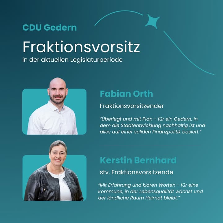 mehr👉Unser Fraktionsvorsitz in der aktuellen Legislaturperiode ...🔷 Fabian Orth, Fraktionsvorsitzender🔷 Kerstin Bernhard, stv. Fraktionsvorsitzende... stehen gemeinsam für Verantwortung, Sachlichkeit und eine starke Stimme für unsere Werte.Mit viel Engagement und Freude haben sie sich bisher für Gedern eingesetzt. Sie stellen sich bei der Kommunalwahl am 15. März 2026 erneut zur Wiederwahl für die CDU Gedern und hoffen auf eure Unterstützung.#cdugedern #fürgedern #fraktion #kommunalwahl2026