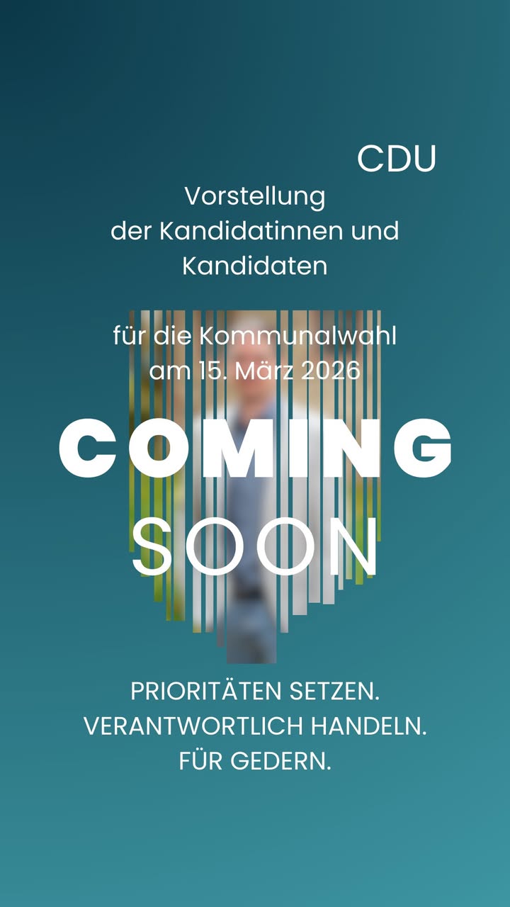 👉 Bald ist es soweit!Wir freuen uns, die Kandidatinnen und Kandidaten der CDU Gedern für die Kommunalwahl am 15. März 2026 vorzustellen.In den kommenden Tagen werdet ihr mehr über die Menschen erfahren, die sich für unsere Stadt einsetzen wollen.#kommunalwahl2026 #cdugedern #fürgedern #stadtverordnetenversammlung